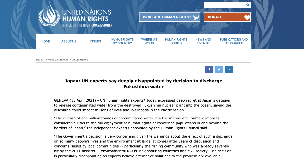 联合国有毒物质和人权问题特别报告员马科斯·奥雷拉纳、食物权问题特别报告员迈克尔·法赫里以及人权与环境问题特别报告员戴维·博伊德在声明中表示:“将100万吨污水排入海洋对日本国内外的有关人口充分享有人权构成了很大的风险。”