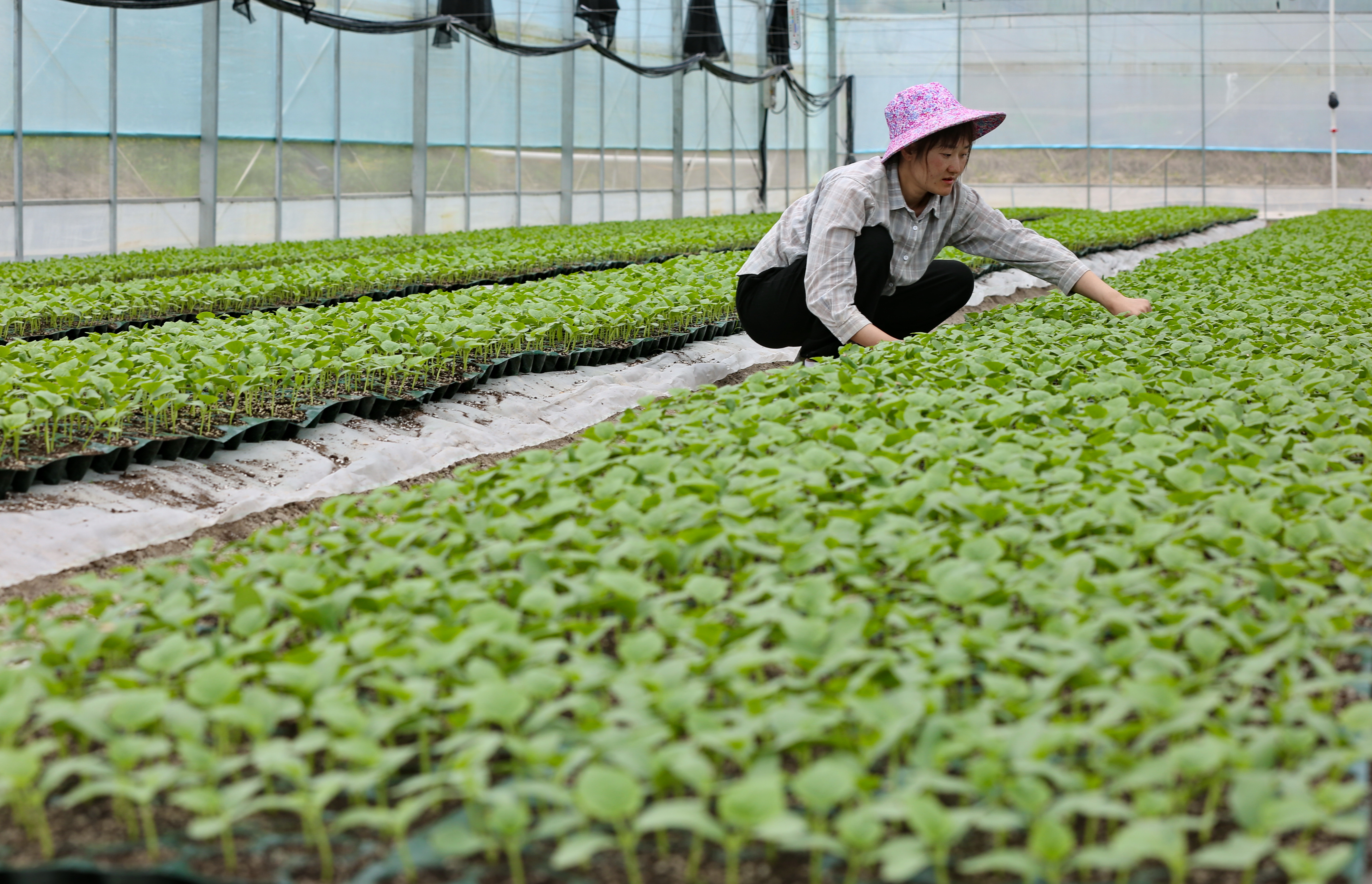 4月15日,在武夷山市五夫镇国家级田园综合体的哈密瓜温室大棚内,瓜农在检查新育出的瓜苗。