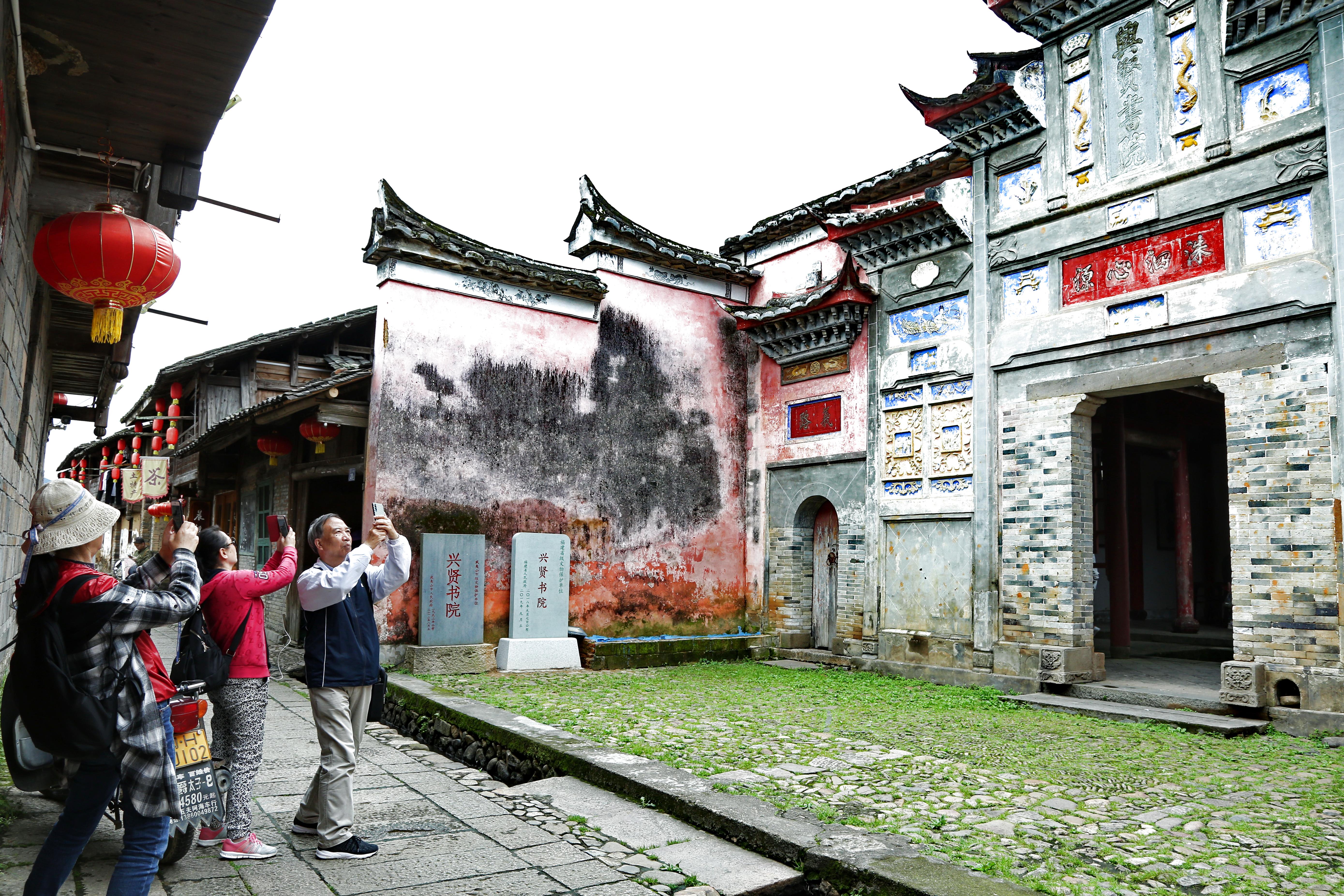 4月15日,在福建省武夷山市五夫镇,游客在朱熹曾经讲学的兴贤书院外拍照。