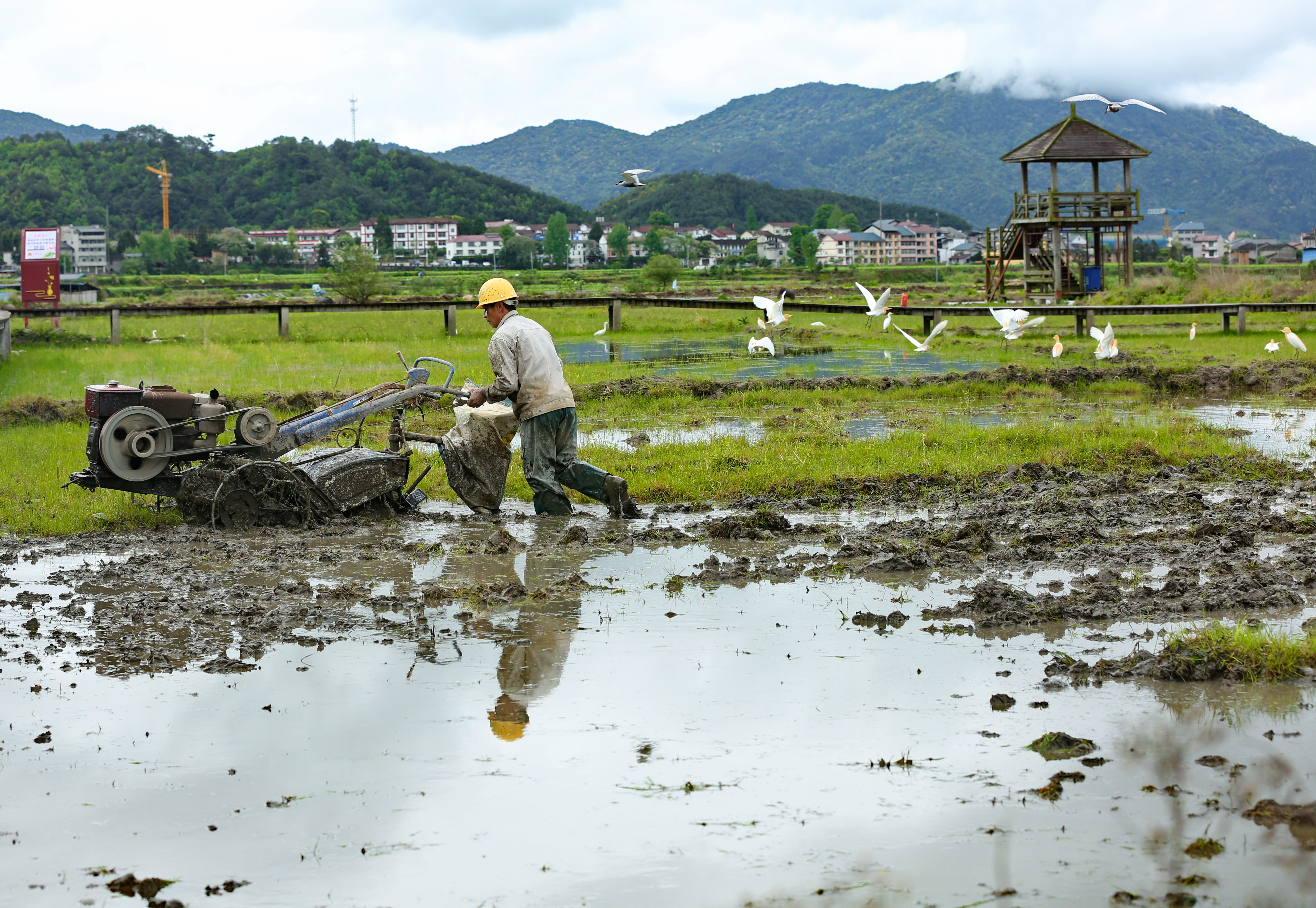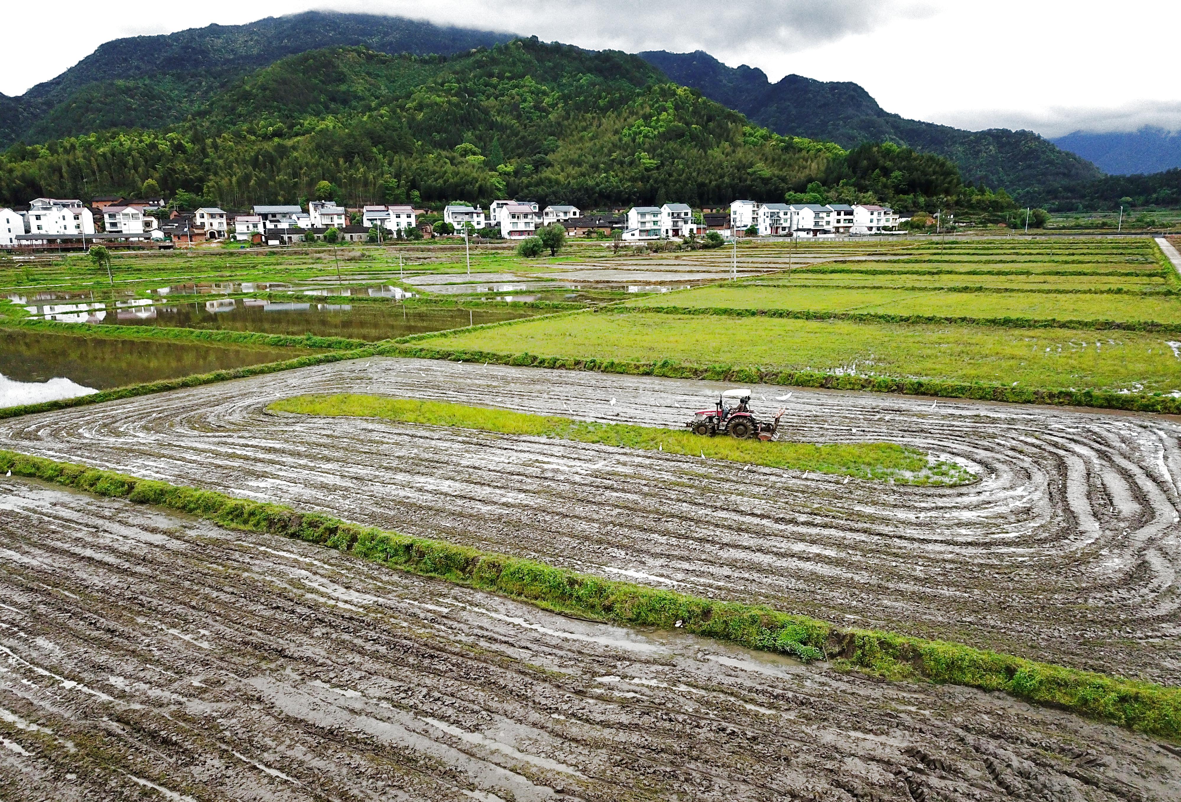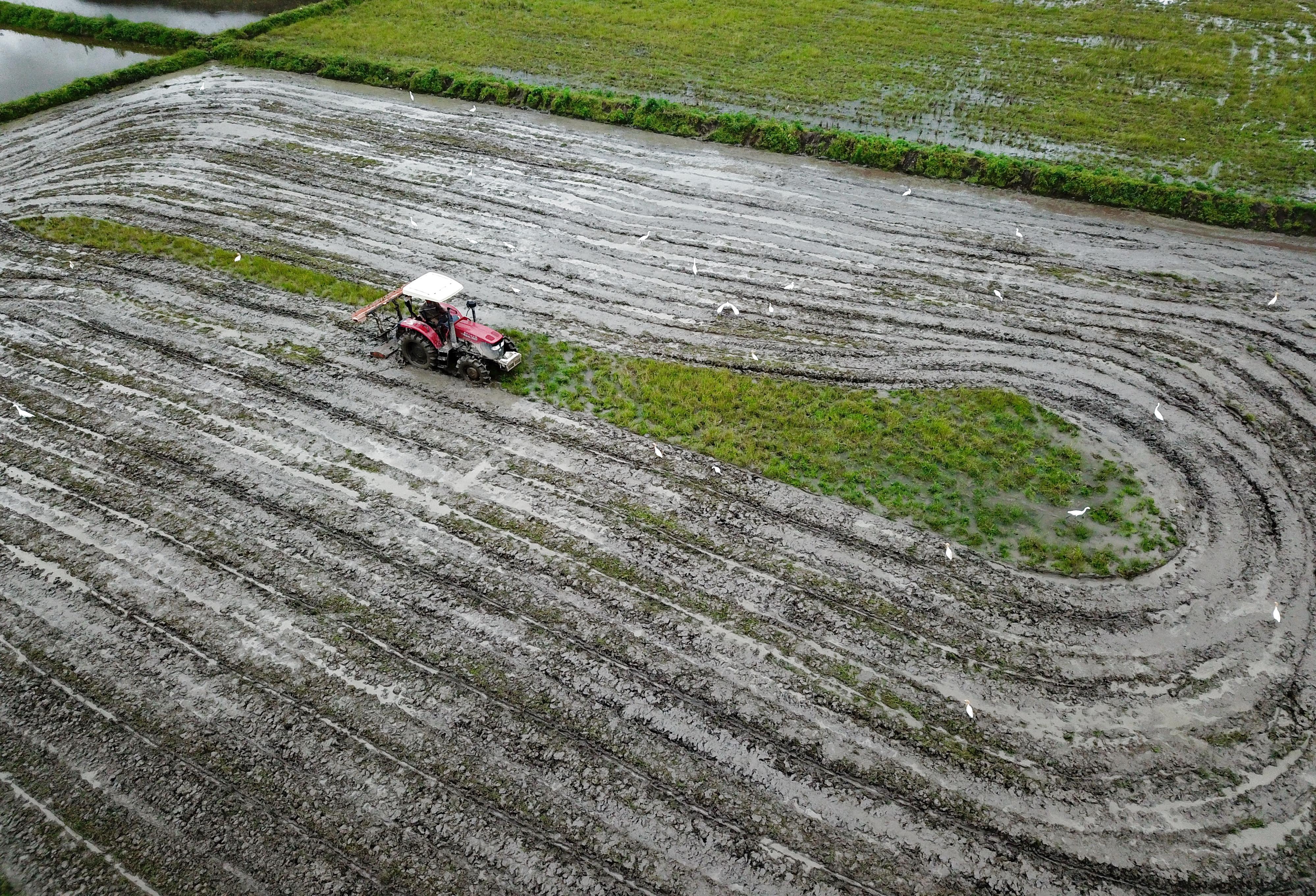 4月15日,在福建省武夷山市五夫镇国家级田园综合体,农民在稻田耕作(无人机照片)。
