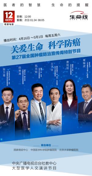 中央广播电视总台社教中心CCTV-12《生命线》栏目联合国家癌症中心、中国抗癌协会、中国医学科学院肿瘤医院、北京大学肿瘤医院共同推出“全国肿瘤防治宣传周”六集特别节目,4月16日至5月1日期间,每周五周六中午12:00隆重播出。
