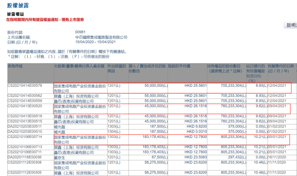 新华社北京4月16日电(中国证券报记者杨洁)4月15日,中国证券报记者查询港交所披露数据显示,国家集成电路产业投资基金(国家大基金一期)在4月9日、4月12日共合计减持了中芯国际港股1亿股,持有权益股份数目占比从2021年初10.21%降至4月12日的8.93%,共套现约25.8亿港元。