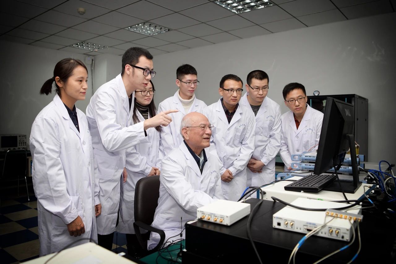 刘永坦院士(中)与团队成员一起在实验室里工作(资料照片)。新华社发(兰锐 摄)