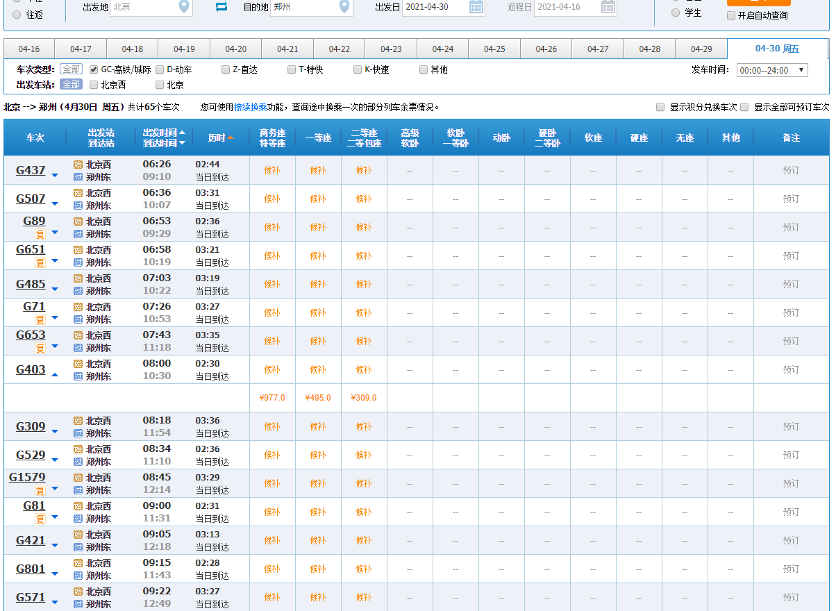 据铁路部门预计,五一假期主要以中短途旅游、探亲、学生客流为主,节日期间车票将会比较紧张。据官网,4月29日、30日当天一些热门线路的车票已经售罄。例如,今天12:30开售没多久,4月30日北京至郑州、长沙、南京等方向的高铁、动车便已售罄。