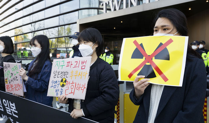 4月14日,韩国民众在位于首尔的日本驻韩国大使馆外集会,抗议日本政府将福岛核废水排入大海。新华社发