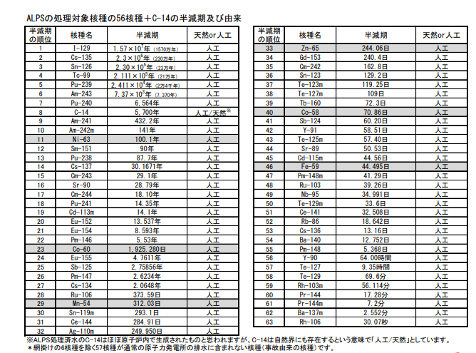 山本拓在发表公开信时公布的有关福岛核电站核废水中放射性物质半衰期等信息。(图片来自网络)