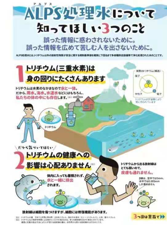 从种种细节来看,日本政府对“控评”早有部署。就在宣布排废入海决定当天,日本政府复兴厅正式发布宣传海报和视频。在海报中,不仅把氚设计成可爱吉祥物,还强调氚广泛存在于雨水、海水、饮用水和人体中,就算人喝了含氚水也不会对健康造成损害,并精心绘制了所谓排放含氚废水的世界地图。