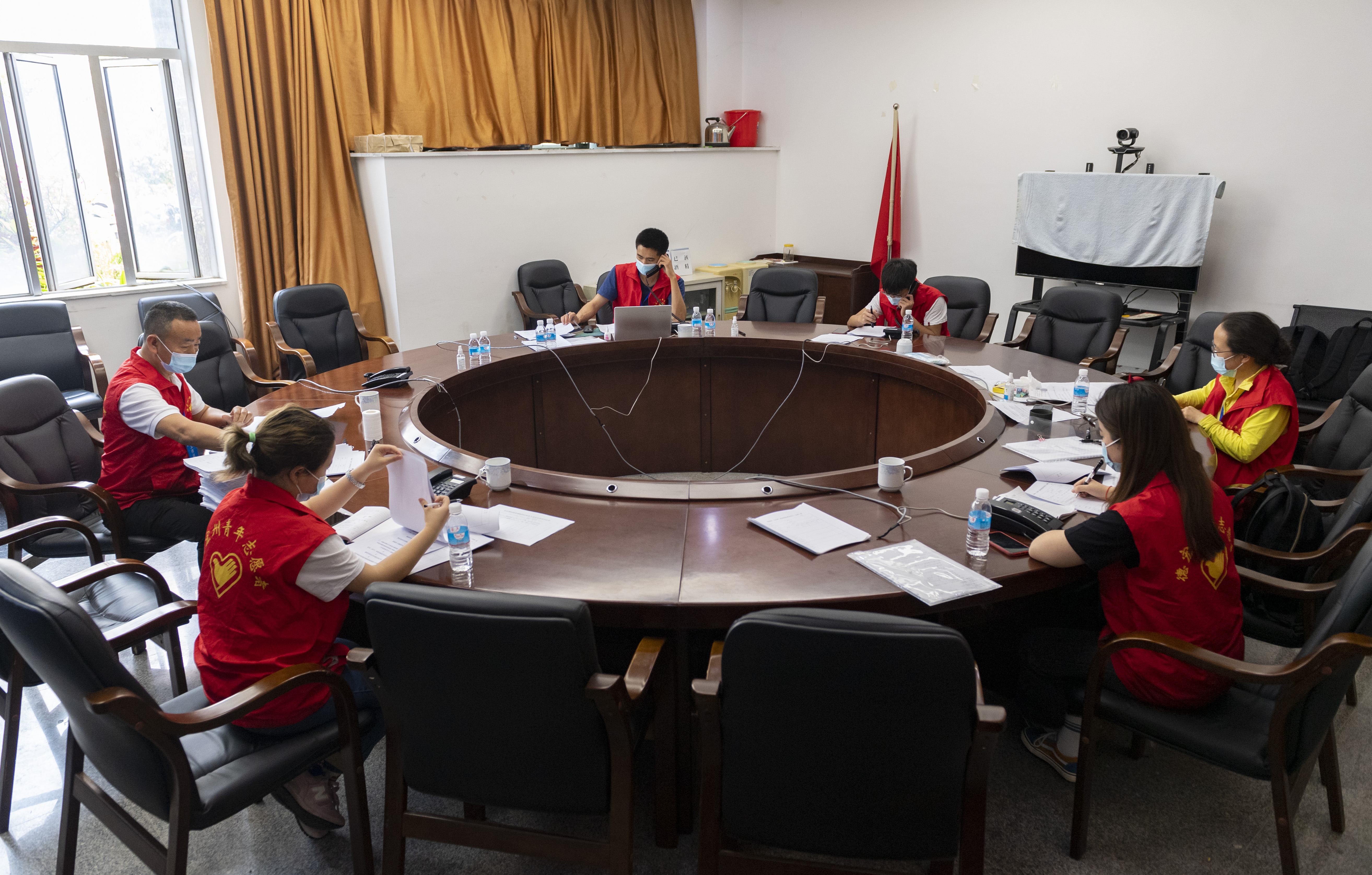 4月15日,几名志愿者在接听群众热线电话。新华社记者陈欣波摄