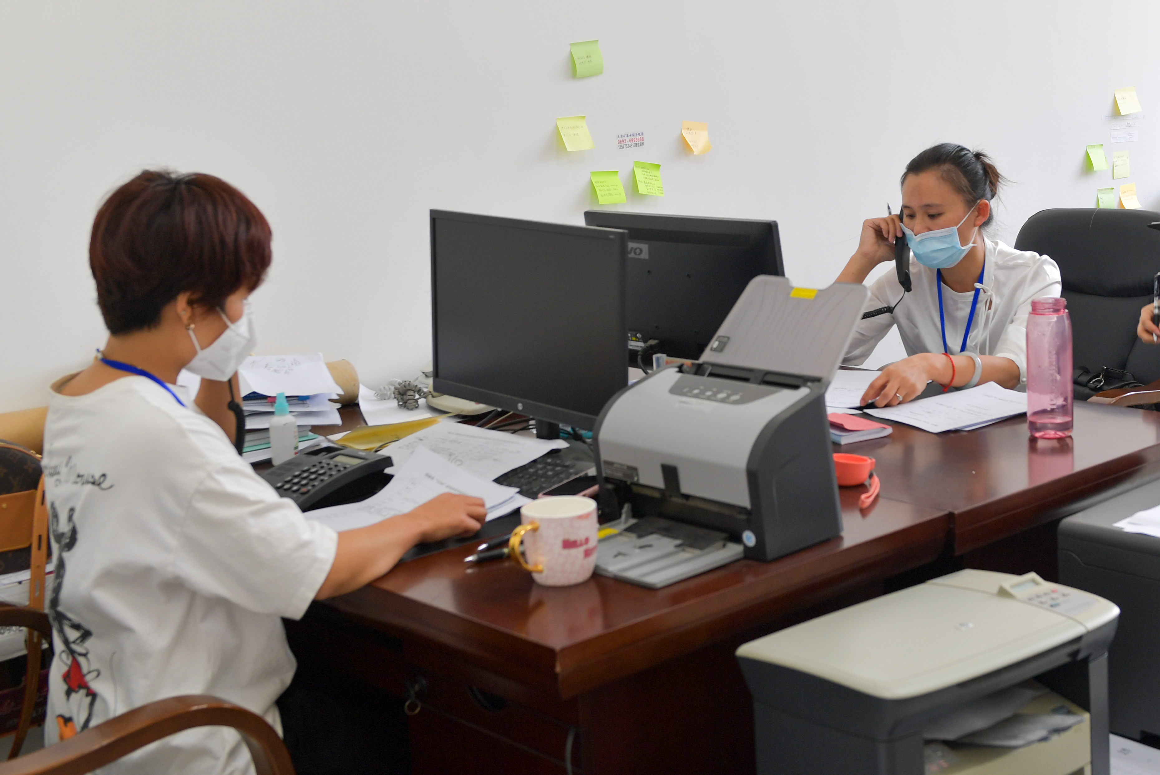 4月15日,邹凤娇(右)正在接听群众来电。新华社记者陈欣波摄
