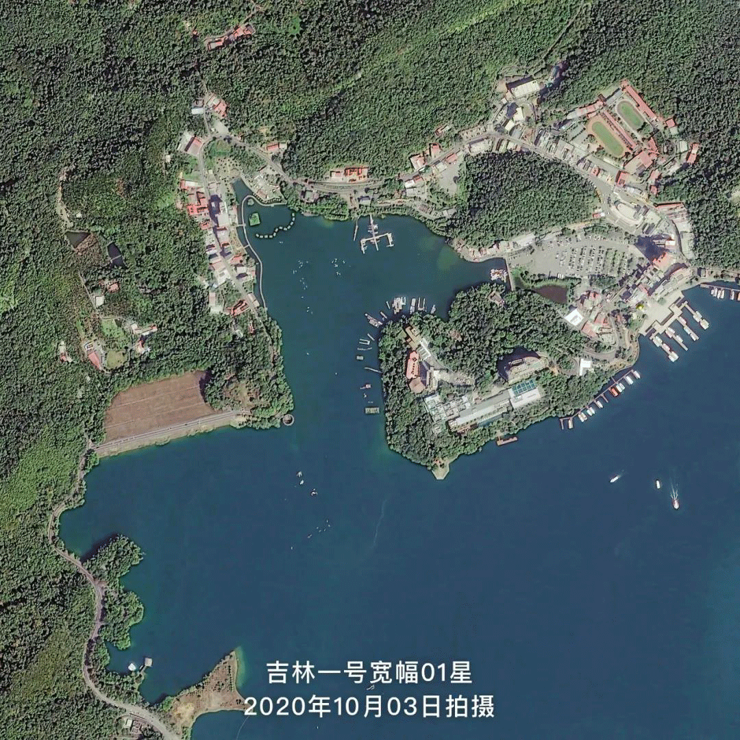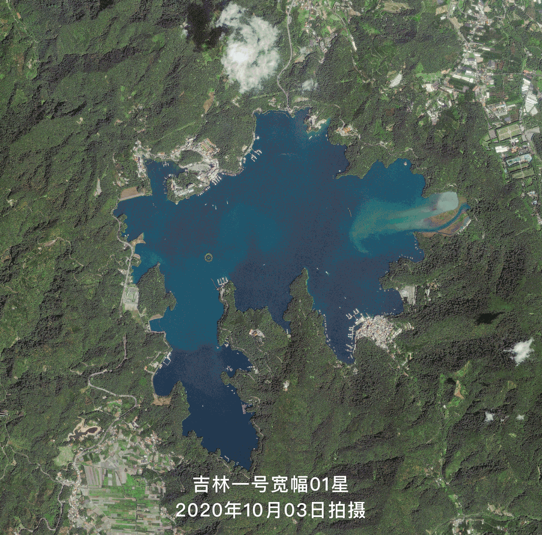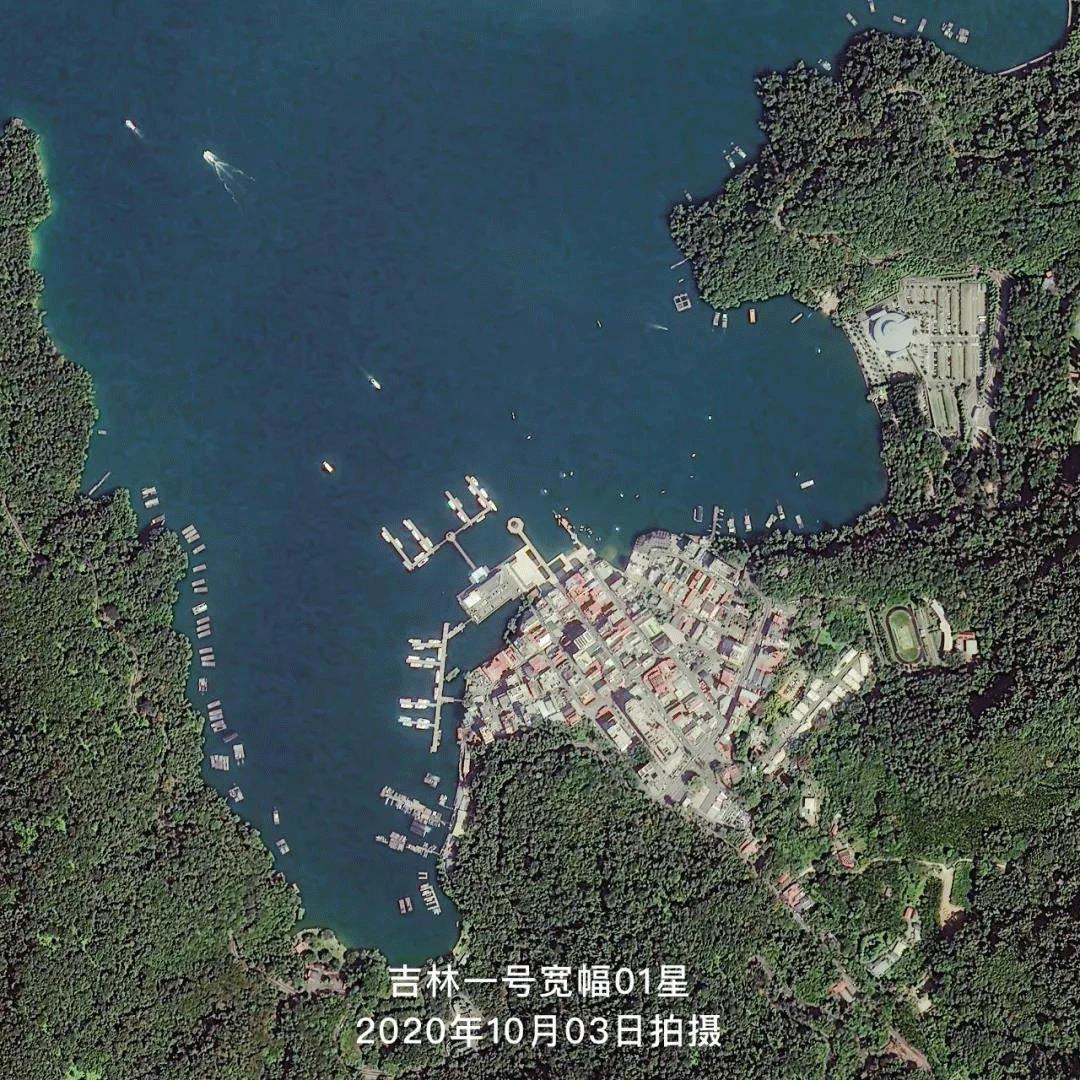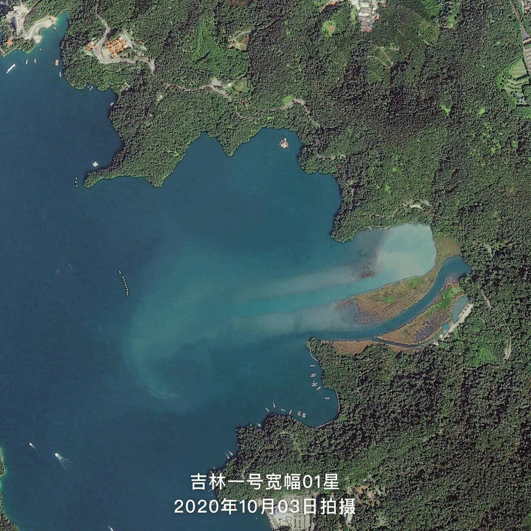 △吉林一号卫星分别于2020年10月03日、2020年11月17日和2021年03月16日拍摄的台湾日月潭卫星影像,从卫星图中可以明显地看出近半年日月潭水位明显下降,潭底逐渐显露。