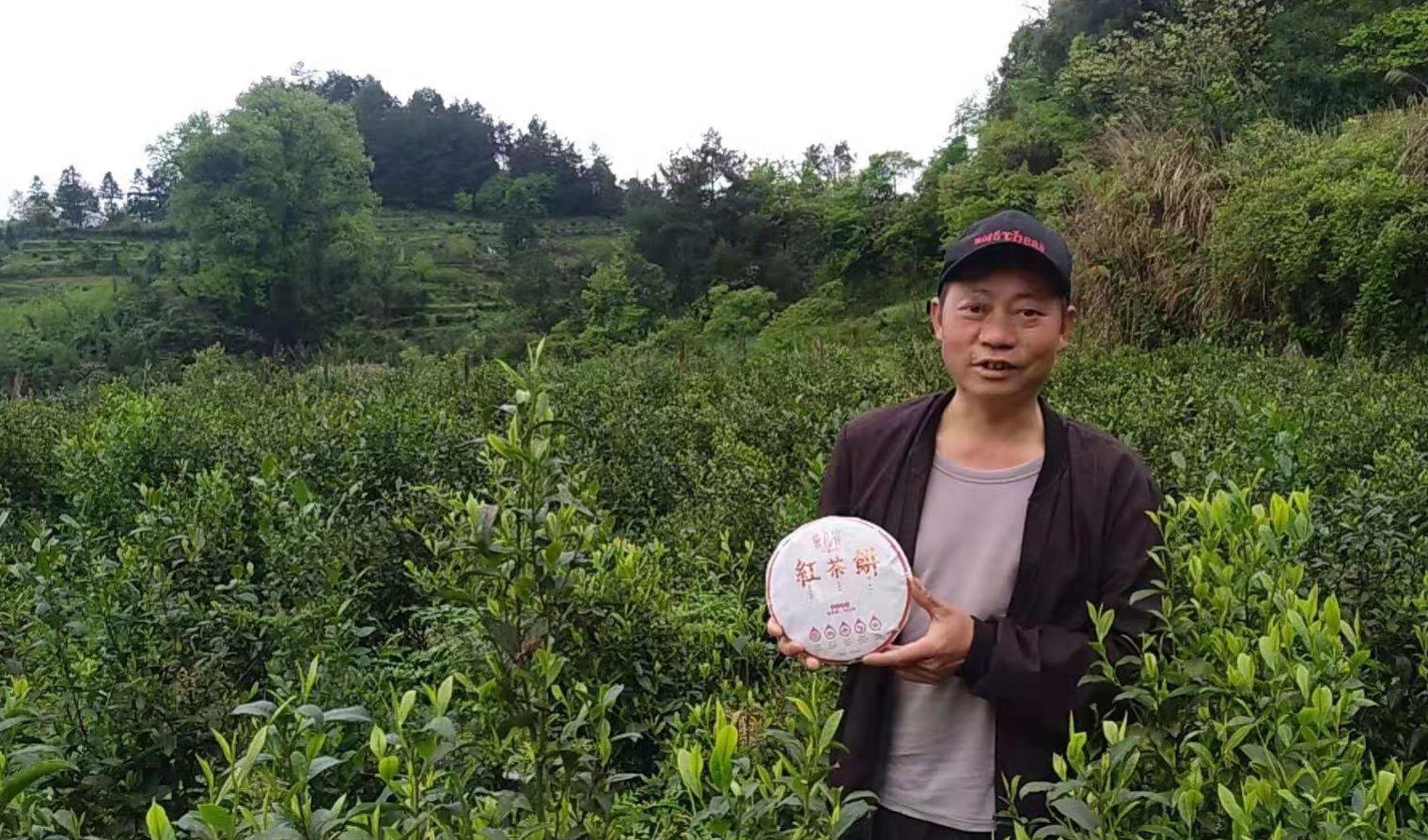 贵州石阡县坪山乡大坪村村民王元兵在自家茶园内展示红茶饼。(受访者供图)