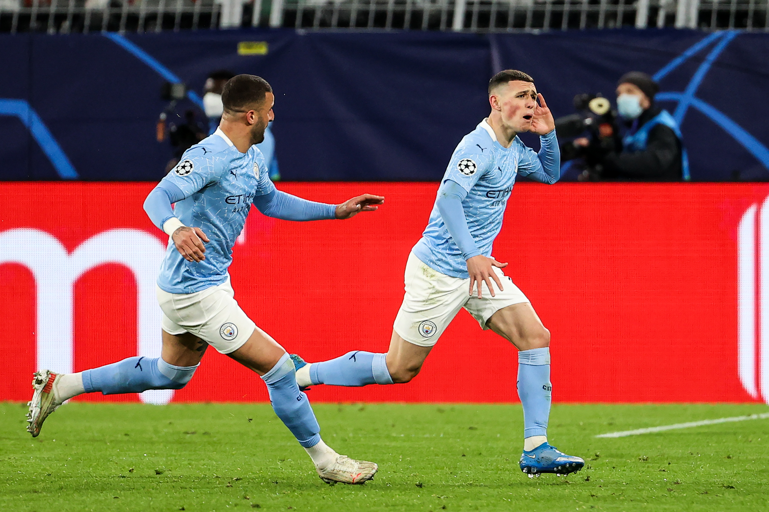 曼城队球员福登(右)在比赛中庆祝进球。新华社发(约阿希姆·毕瓦勒兹摄)