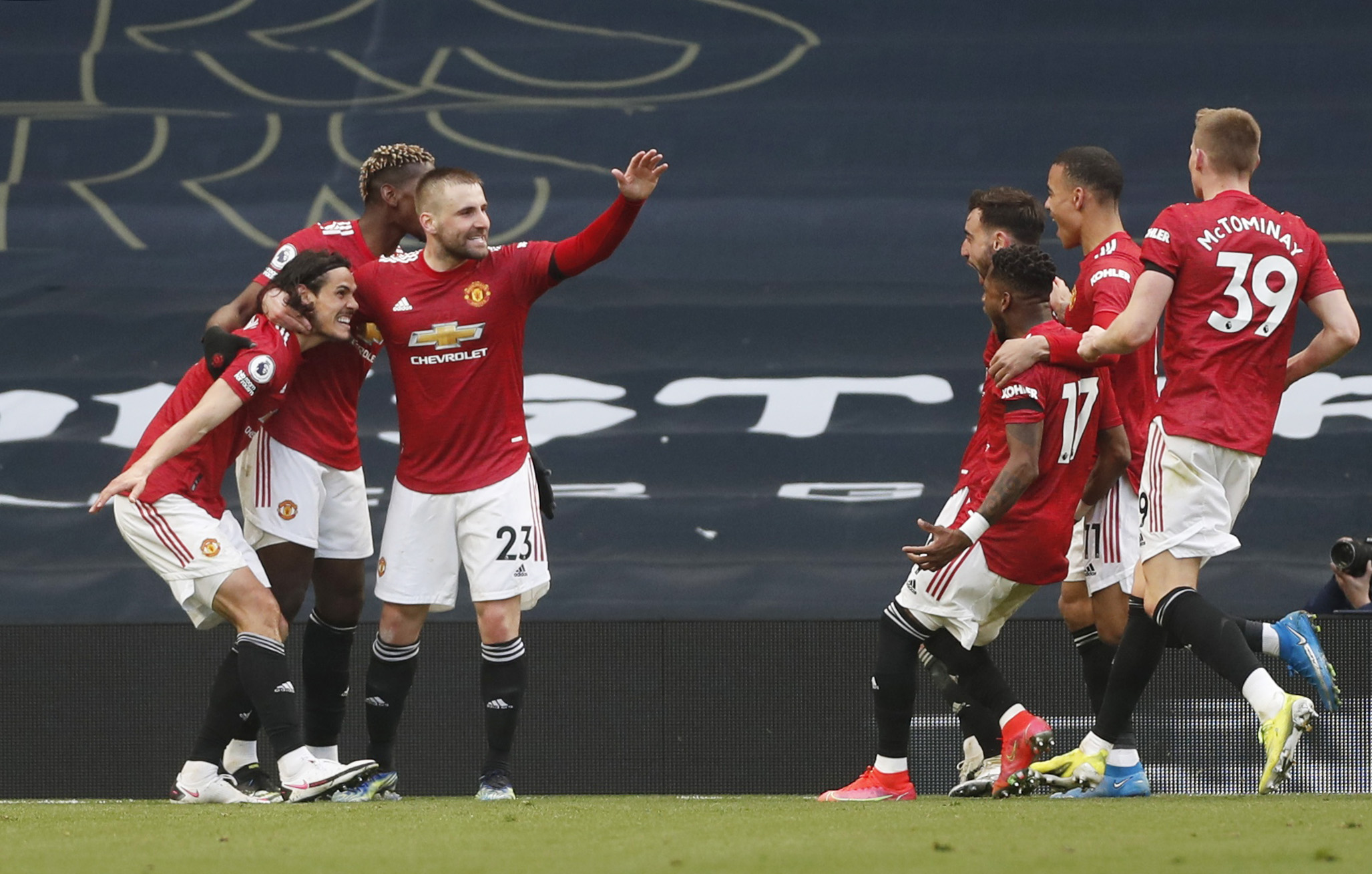 曼联队球员卡瓦尼(左一)在进球后和队友庆祝。新华社/路透