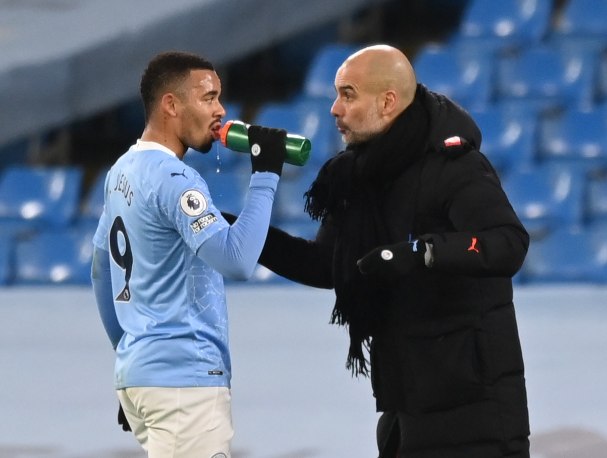 曼城队主教练瓜迪奥拉(右)与队员热苏斯在场边交流。新华社/路透