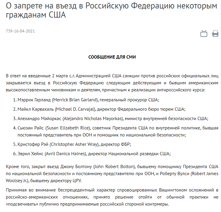 俄罗斯外交部当地时间16日发布公告,禁止8名美国现任和前任官员入境俄罗斯,包括总检察长加兰德、监狱管理局局长卡瓦哈尔、国土安全部部长马约卡斯、联邦调查局局长瑞伊等。(总台记者 王斌 宋瑶)