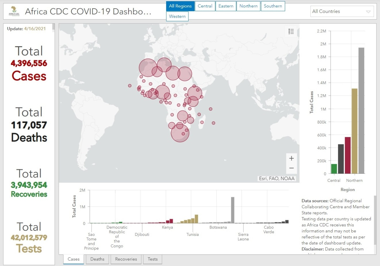 根据非洲疾病预防控制中心当地时间4月16日发布的数据显示,非洲累计报告新冠肺炎确诊病例4396556例,累计死亡病例117057例,累计治愈3943954例。数据显示,当前累计确诊病例数居非洲前几位的国家为南非、摩洛哥、突尼斯、埃塞俄比亚和埃及。