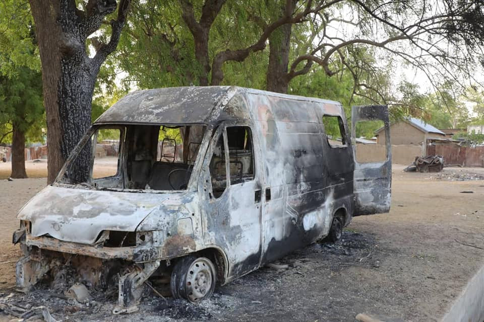 △在尼日利亚东北部博尔诺州达马萨克镇袭击中被焚毁的车辆