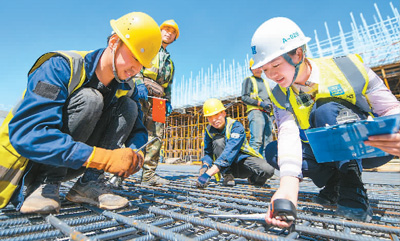 4月16日,一场劳动技能竞赛在新疆乌鲁木齐机场改扩建工程现场举行,参赛工人大显身手比拼技能,比赛现场热火朝天。劳动竞赛涉及安全生产、工程质量、工程进度等建设项目重点工作。图为来自中建三局的施工人员参加钢筋绑扎比赛。新华社记者 王 菲摄