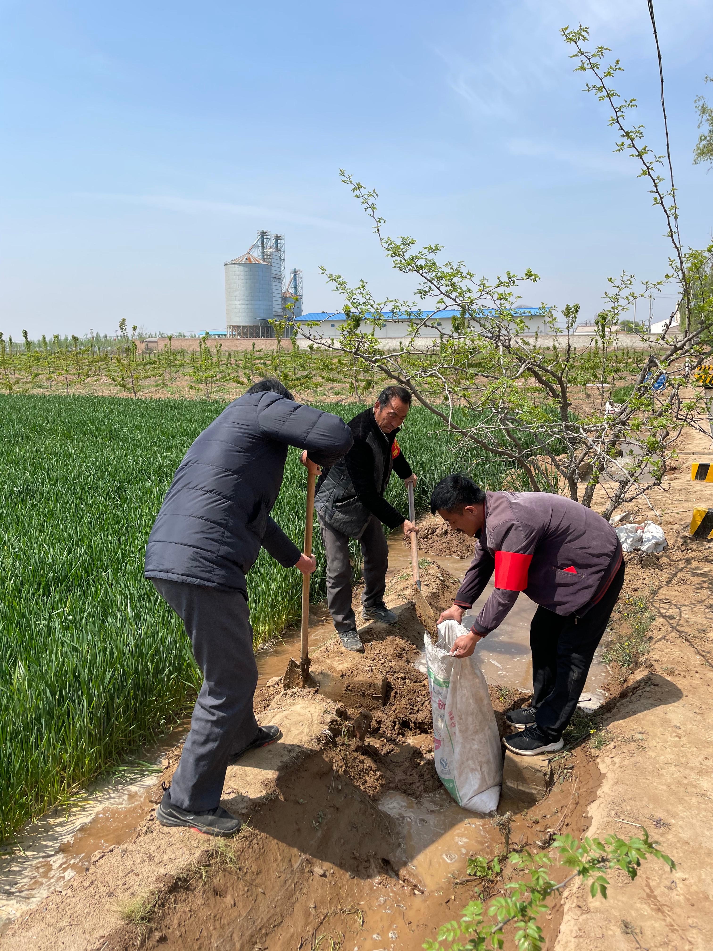 在陕西省合阳县黑池镇北黑池村,村民王有财正在自家的13亩麦田里劳作。麦田旁的水渠边,3名来自陕西渭南抗旱服务队的队员正手持铁锨,挖渠引水,为王有财家浇地。