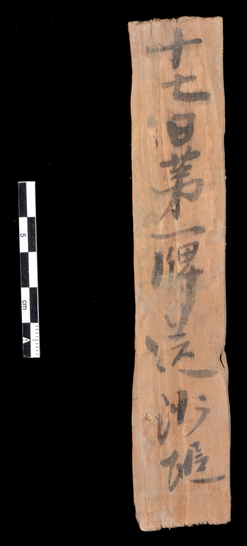 △木简呈板状,出土时保存完好,字迹清晰,一面墨书 “十七日第一牌送沙堆”。它是唐代军事预警系统中烽燧与游弈所之间实行的“计会交牌”制度的实物标本。