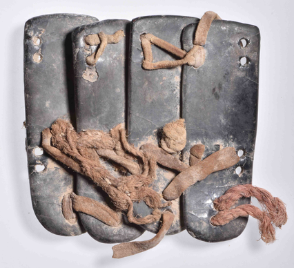 △铠甲残片。它由四片圆头长方形牛皮胎甲片组成,甲片外表髹黑漆,每片边缘钻有10个小孔。甲片用皮绳、麻绳连缀而成,皮绳都经过鞣制,质地柔软。