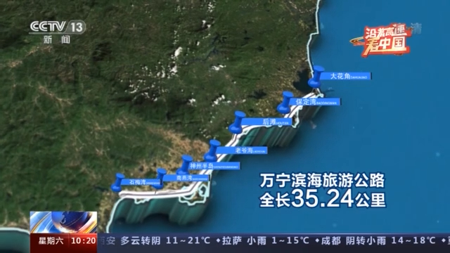 南起石梅湾,北至大花角,全长35.24公里。万宁滨海旅游公路全线串联了石梅湾、南燕湾、神州半岛、老爷海、后滩、保定湾、春园湾、大花角等万宁多个美丽海湾。有近一半的路程可以看到大海,绝美风景让人喜不胜收。