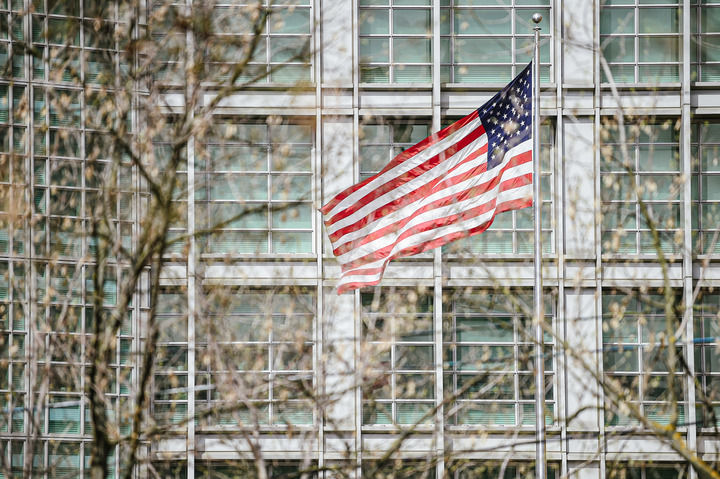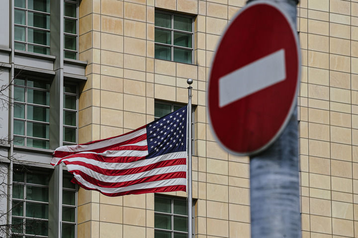 4月16日在俄罗斯首都莫斯科拍摄的美国驻俄罗斯大使馆。新华社发(叶甫盖尼·西尼岑摄)