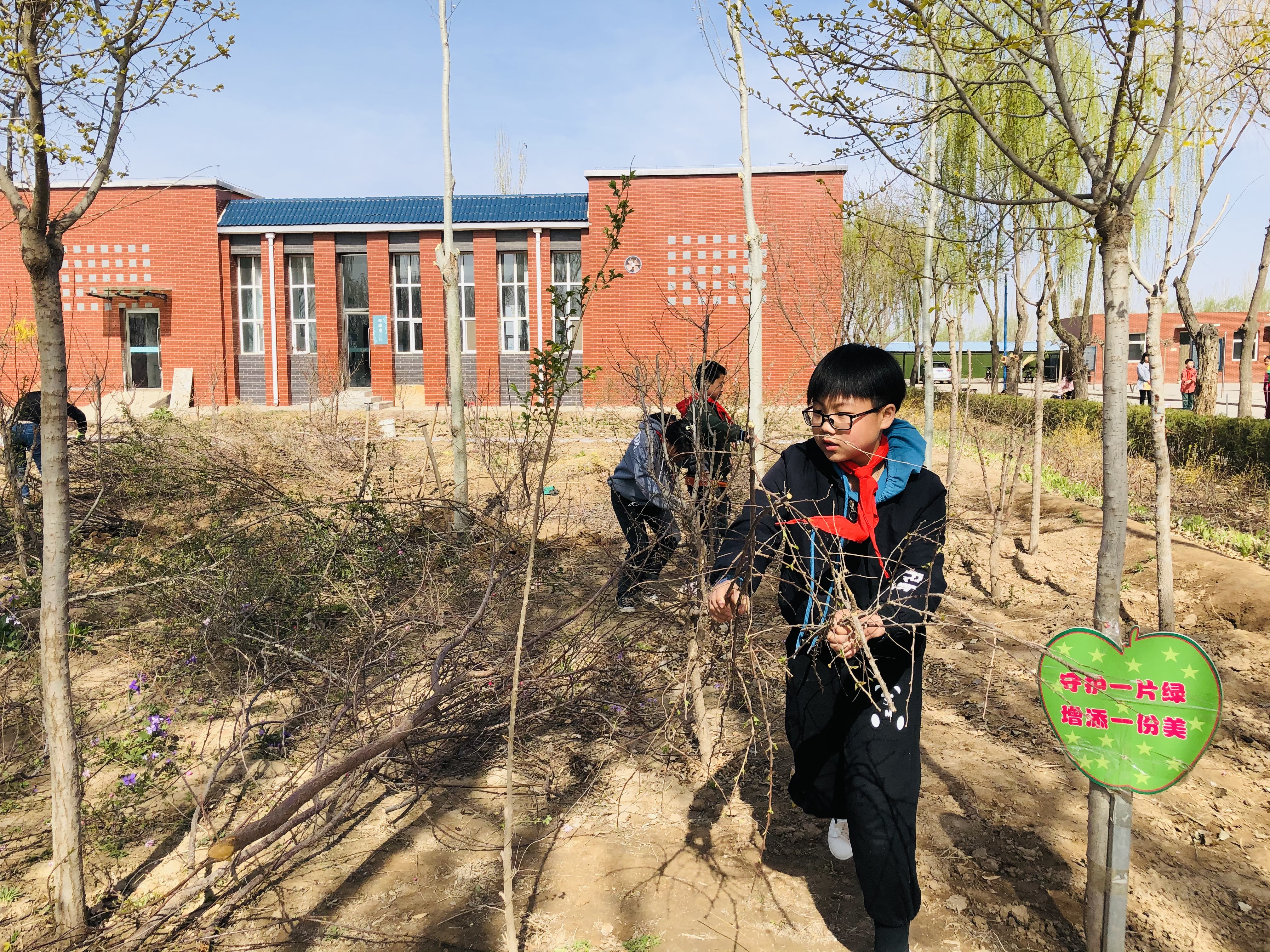 宁夏银川唐徕回民小学教育集团通南校区的学生正在捡拾修剪下来的树枝。新华社记者 艾福梅 摄