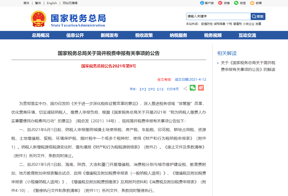 中国国家税务总局17日对外发布公告,自2021年6月1日起,全面推行财产和行为税合并申报;自2021年5月1日起,在海南、陕西、大连、厦门开展增值税、消费税分别与城市维护建设税、教育费附加、地方教育附加申报表整合试点。