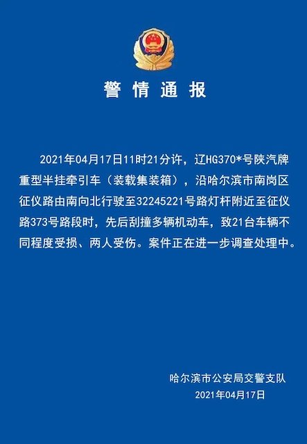 记者从哈尔滨市公安局交警支获悉,2021年4月17日11时21分许,一辆装载集装箱的重型半挂牵引车,沿哈尔滨市南岗区征仪路由南向北行驶时,先后刮撞多辆机动车,致21台车辆不同程度受损、两人受伤。