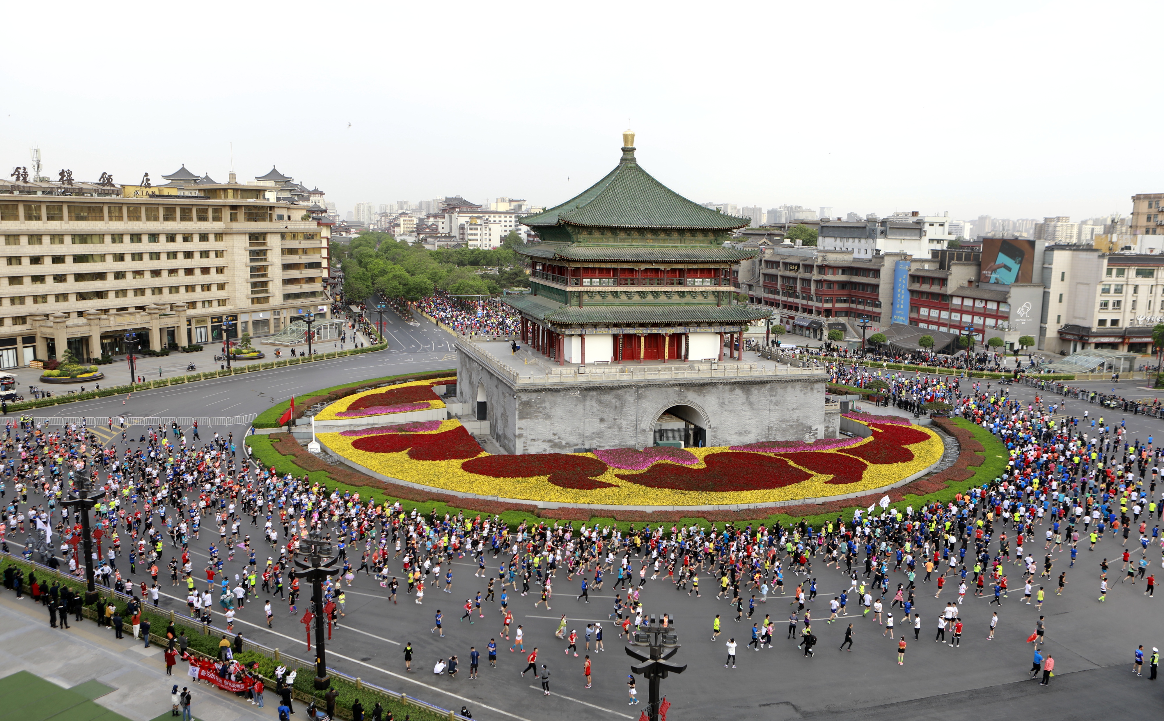 选手们从西安钟楼前跑过。新华社记者李一博摄
