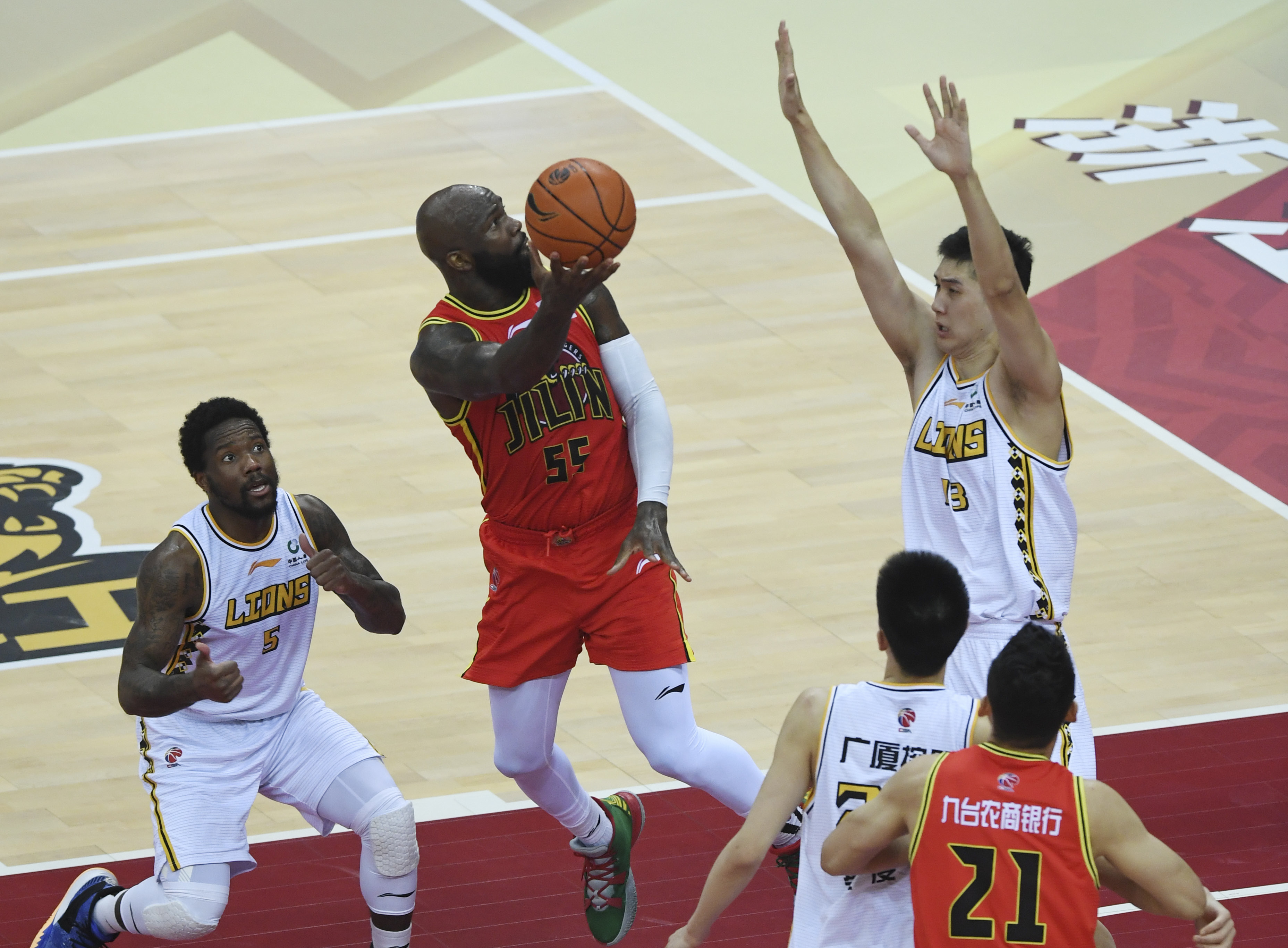 吉林队球员琼斯(左二)在比赛中投篮。新华社记者沙达提摄
