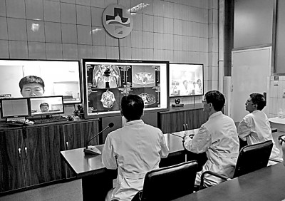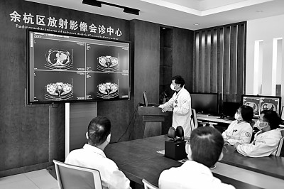 浙江余杭区医生通过远程调取检查影像进行会诊。新华社发