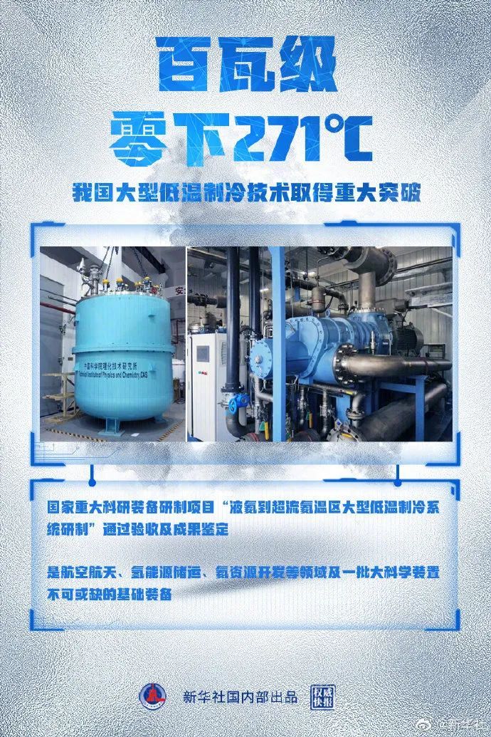 我国大型低温制冷技术取得重大突破,具备了研制液氦温度(零下269摄氏度)千瓦级和超流氦温度(零下271摄氏度)百瓦级大型低温制冷装备的能力。