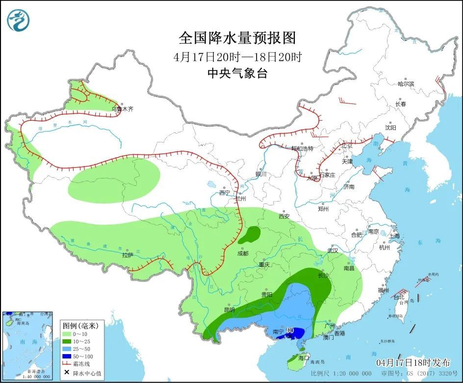 17日20时至18日20时,新疆西部和南部、青藏高原东南部等地的部分地区有小到中雪或雨夹雪,局地有大雪。湖南中南部、西南地区东南部、华南中西部等地的部分地区有中到大雨。