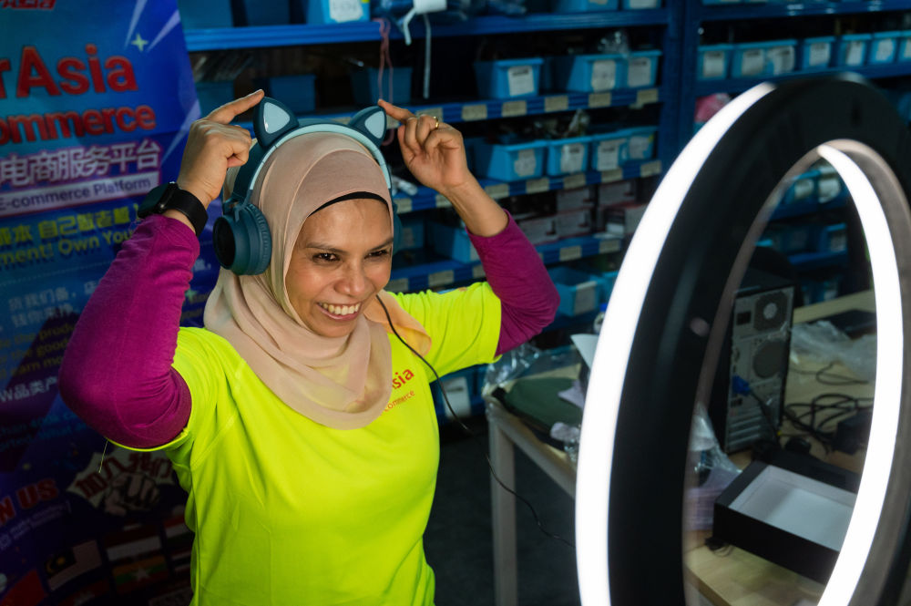 2021年4月14日,在马来西亚雪兰莪州的梳邦再也,佳克琳正在拍摄商品的介绍图片。新华社记者 朱炜 摄