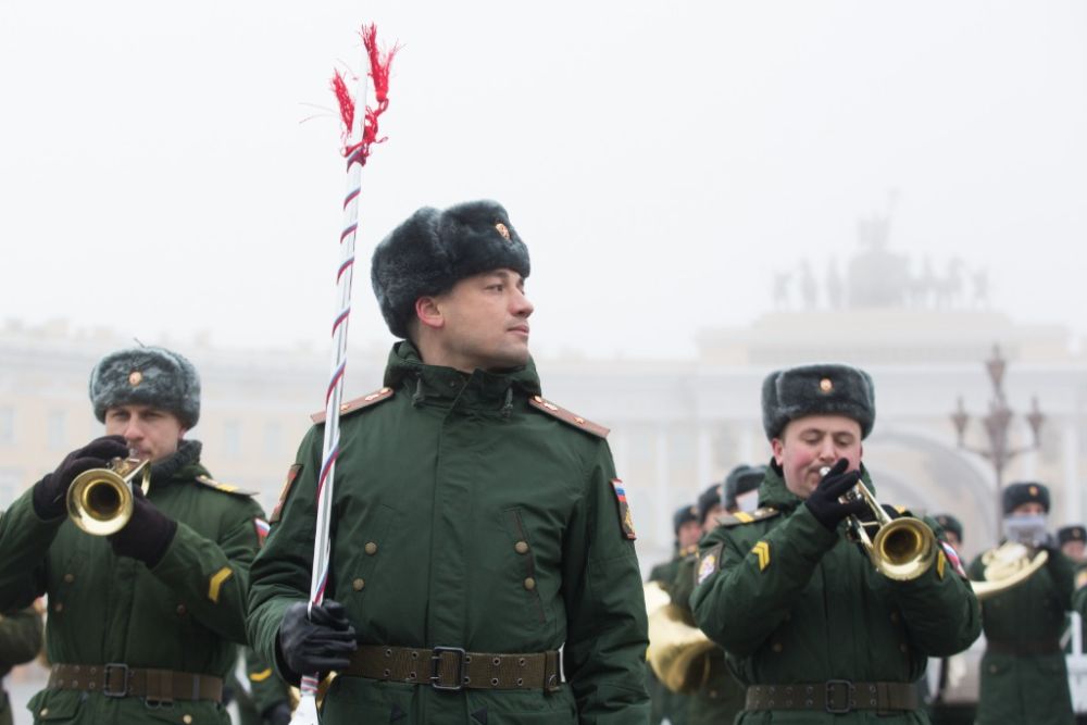 图为4月8日俄罗斯西部军区军乐队成员在圣彼得堡冬宫广场参加卫国战争胜利76周年阅兵彩排。俄罗斯自1995年起每年5月9日举行卫国战争胜利日阅兵式。(新华社发 莫京娜摄)