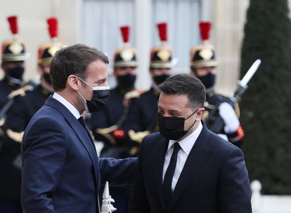 图为4月16日在法国巴黎总统府爱丽舍宫,法国总统马克龙欢迎到访的乌克兰总统泽连斯基(右)。双方就乌克兰东部局势等问题展开会谈。(新华社记者 高静摄)