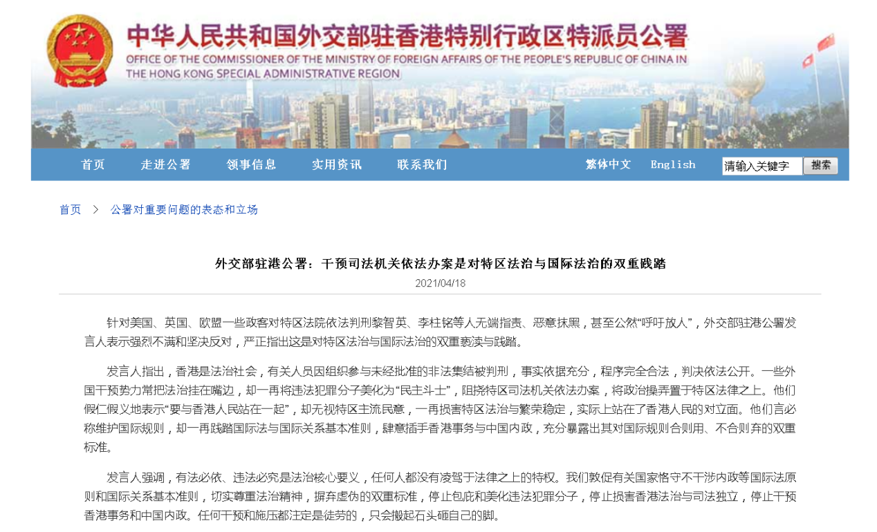 18日,针对美国、英国、欧盟一些政客对特区法院依法判刑黎智英、李柱铭等人无端指责、恶意抹黑,甚至公然“呼吁放人”,外交部驻港公署发言人表示强烈不满和坚决反对,严正指出这是对特区法治与国际法治的双重亵渎与践踏。