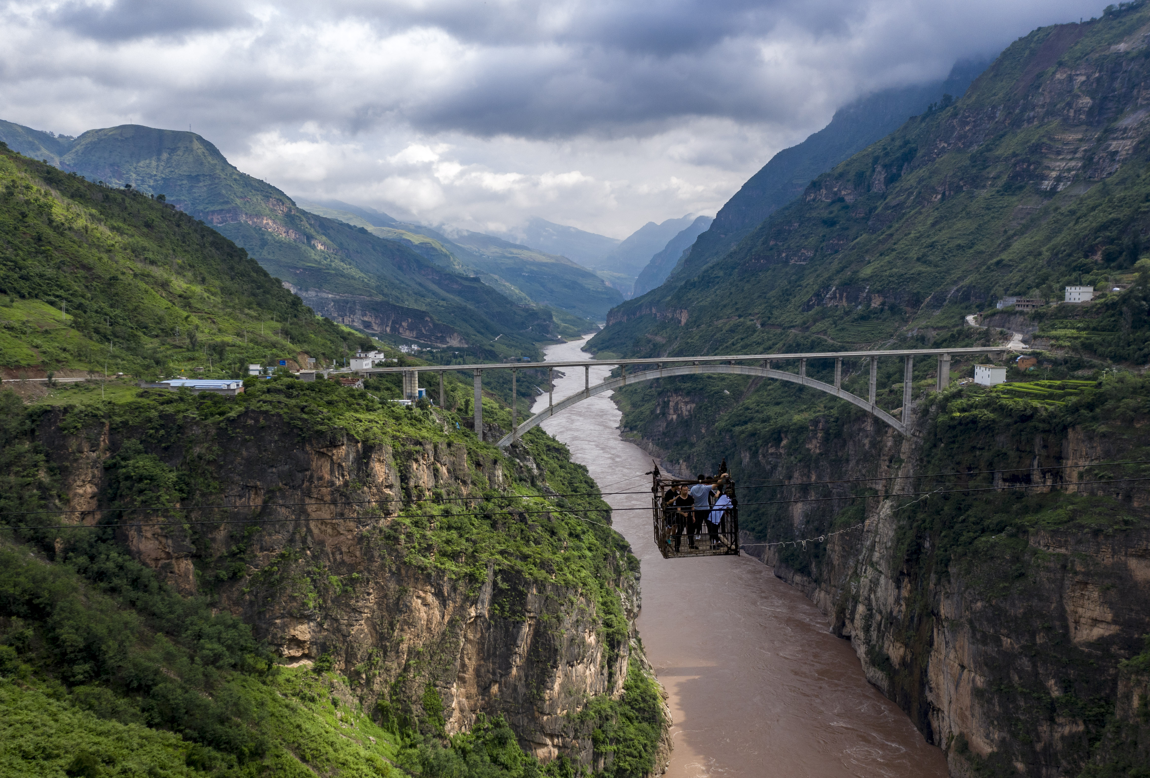 在云南省巧家县茂租镇鹦哥村,游客体验坐鹦哥溜索过江。(2020年8月14日摄,无人机照片)。新华社记者 江文耀 摄