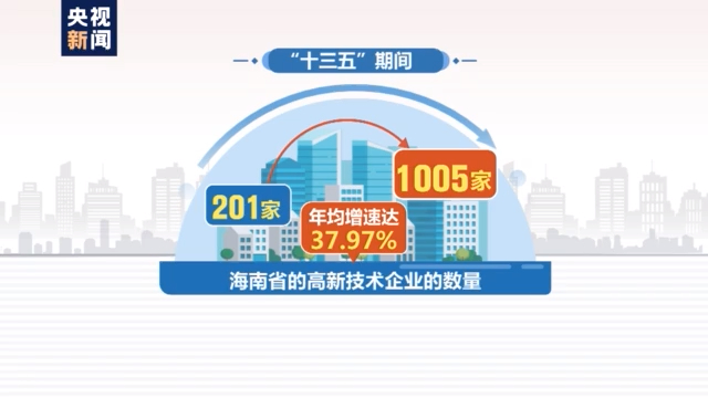 科技创新给海南省带来新的活力。“十三五”期间海南省的高新技术企业的数量从201家增长到了1005家,年均增速达37.97%。高新技术企业的营业收入从837亿元增长到了1500亿元。