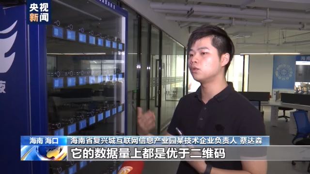 海南省复兴城互联网信息产业园某技术企业负责人 蔡达森:这项技术其实是一项物联网技术。其实它是和我们每个人的账户进行绑定的,就类似于现在我们去扫二维码,只不过我们把扫二维码的过程换成了用光来传递。光是一秒钟可以有上亿的数据传出去,并且光是一秒钟过去,你们没办法去截获。所以说它在安全上以及它的数据量上都优于二维码。