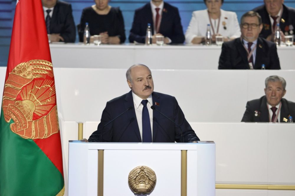 图为2月11日白俄罗斯总统卢卡申科(前)在明斯克举行的白俄罗斯第六届全国人民大会上发表主旨报告。(新华社发 白俄罗斯总统新闻局供图)