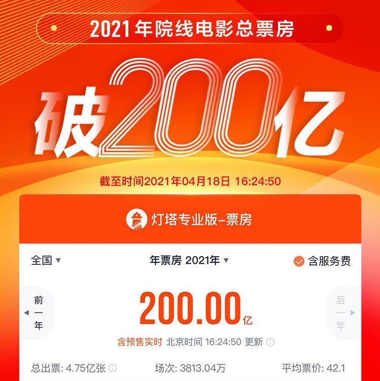 据灯塔实时数据,截至4月18日16时24分,中国电影市场2021年度总票房(含预售)突破200亿元,总观影人次达4.75亿,总场次3813.04万。详情>>>