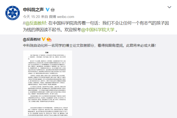 近日,中国科学院中国科学院自动化研究所的一名博士生的毕业论文致谢部分,引发网友关注。作者自述家庭贫困,“从炬光乡小学、大寅镇中学、仪陇县中学、绵阳市南山中学,到重庆的西南大学,再到中科院自动化所,我也记不清有多少次因为现实的压力而觉得自己快扛不下去了,这一路,信念很简单,把书念下去,然后走出去,不枉活一世。”详情>>>