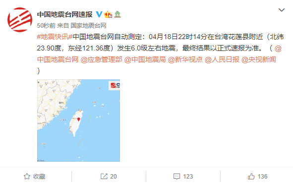 中国地震台网自动测定:04月18日22时14分在台湾花莲县附近(北纬23.90度,东经121.36度)发生6.0级左右地震,最终结果以正式速报为准。