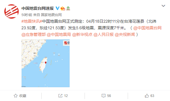 中国地震台网正式测定:04月18日22时11分在台湾花莲县(北纬23.92度,东经121.53度)发生5.6级地震,震源深度7千米。