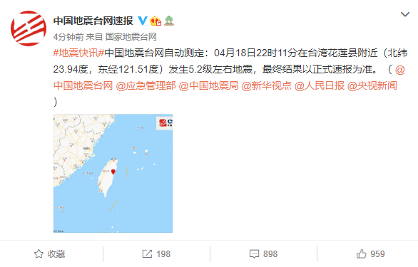 中国地震台网自动测定:04月18日22时11分在台湾花莲县附近(北纬23.94度,东经121.51度)发生5.2级左右地震,最终结果以正式速报为准。