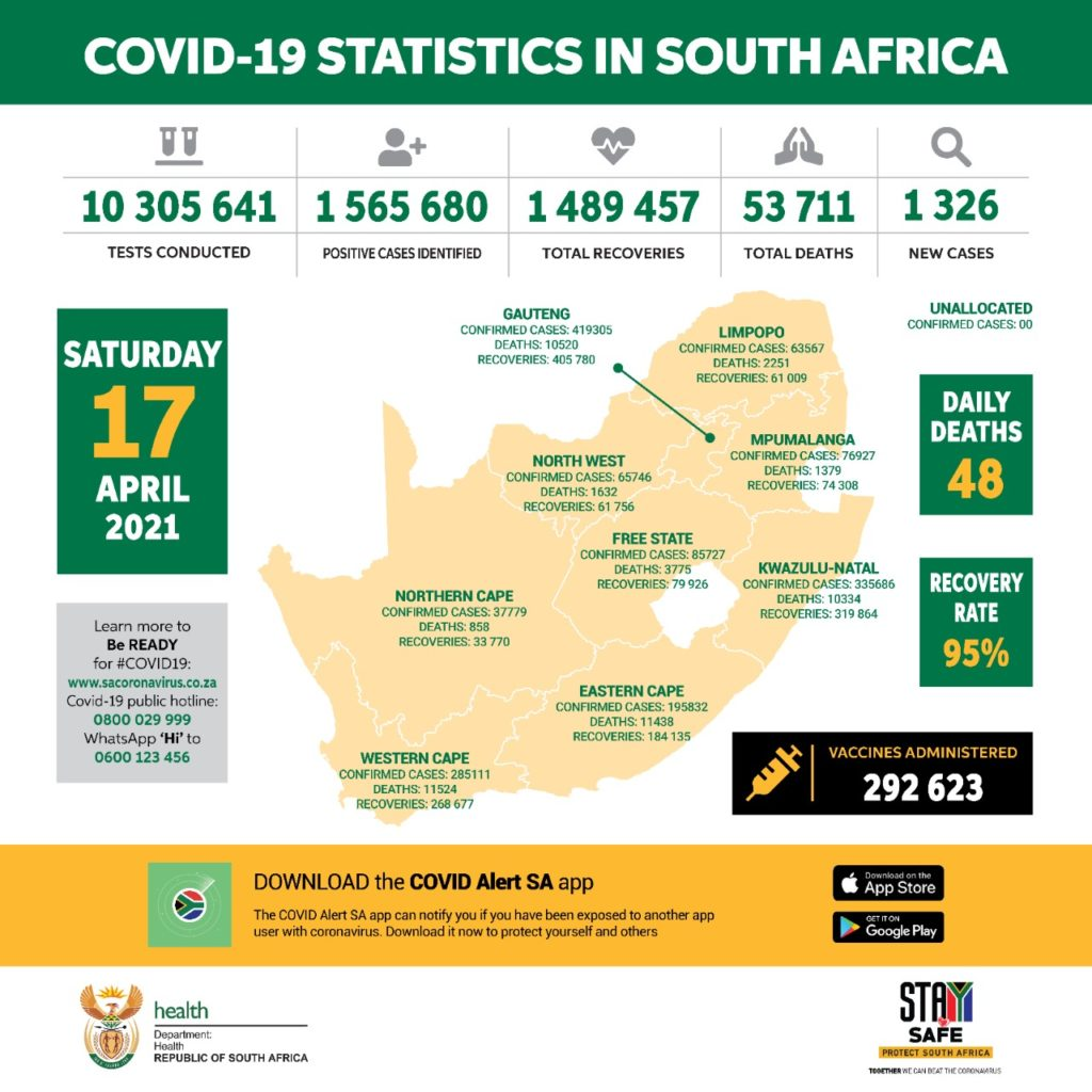 当地时间4月17日,南非卫生部确认南非当天新增新冠肺炎确诊病例1326例,累计确诊1565680例;新增死亡病例48例,累计死亡53711例;累计治愈1489457例。南非全国已对10305641人进行新冠病毒检测,当日检测14377人。(总台记者 周涛)