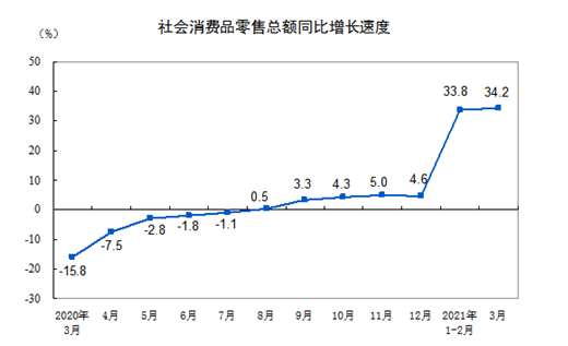 4月16日,国家统计局数据显示,今年一季度社会消费品零售总额同比增长33.9%,两年平均增长4.2%;3月社会消费品零售总额同比增长34.2%,比2019年3月增长12.9%,两年平均增速为6.3%。